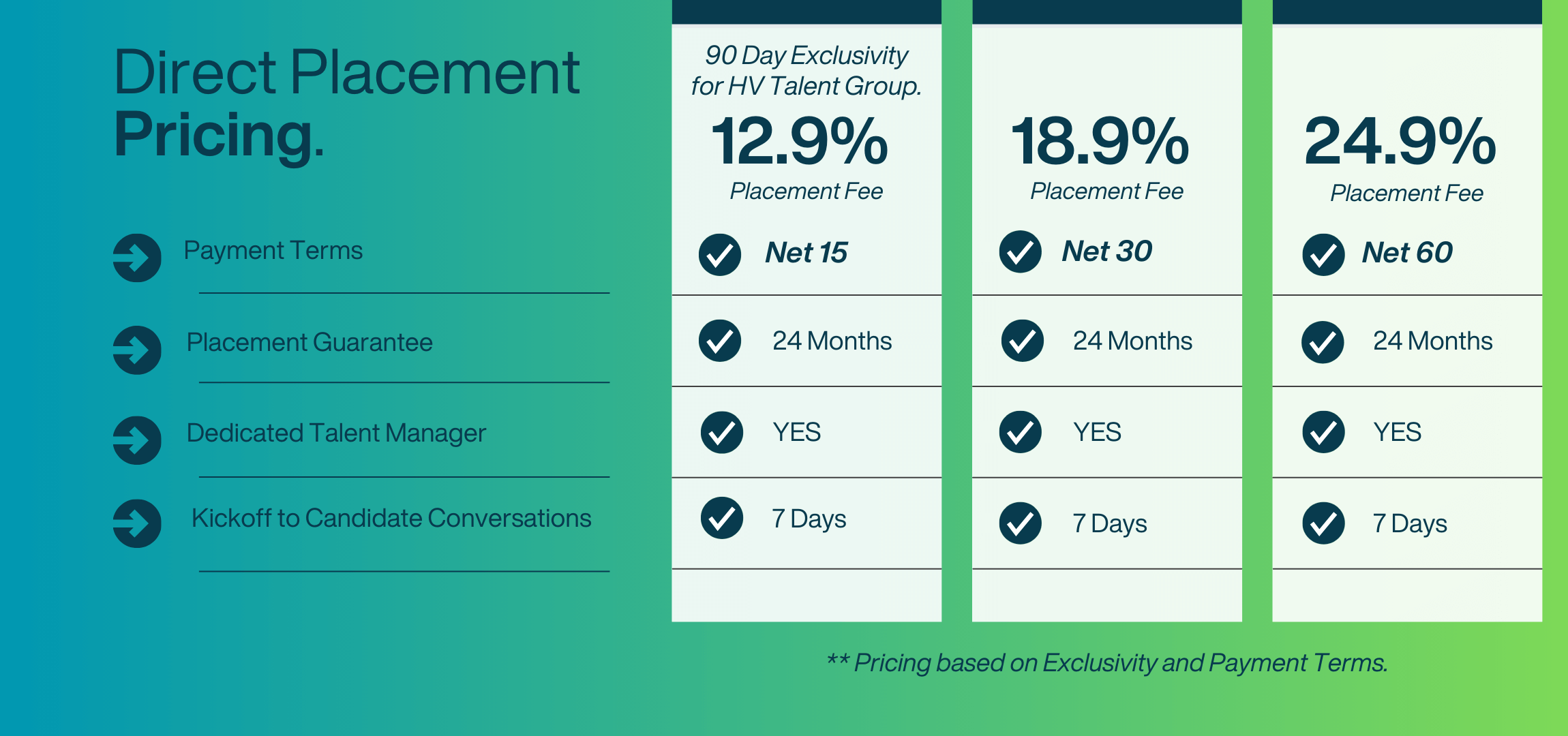 HV Talent Group offers a placement guarantee on Direct Placement Services of 24 months. We will follow up regularly to see how your new team member is doing. If for any reason you are not satisfied, we will replace your hire with one backfill within the agreed placement guarantee.